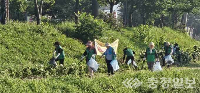 충남 홍성군 홍성읍 남녀새마을지도자회는 지난 집중호우로 홍성천 일원에 떠밀려온 각종 쓰레기와 부유물을 제거하기 위해 지난 25일 오전 6시부터 자발적으로 모여 환경정화 활동에 나섰다.