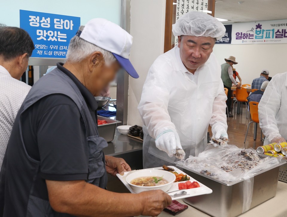 이범석 충북 청주시장은 30일 중복을 맞아 내덕노인복지관에서 노인 500여 명에게 전복삼계탕을 대접하는 봉사활동에 참여했다.
