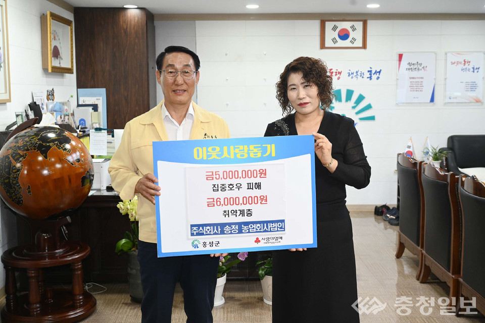 충남 홍성군은 지난 30일 주식회사 송정 농업회사법인이 호우피해 복구 및 지원을 위한 성금 500만원과 취약계층을 위한 성금 600만원, 총 1100만원의 성금을 기탁했다.