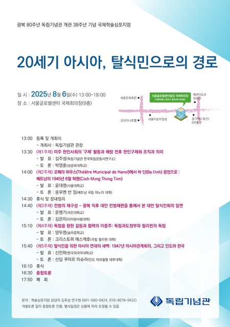 독립기념관은 6일 오후 1시부터 서울 글로벌센터 9층 국제회의장에서 광복 80주년 및 개관 38주년 기념 국제 학술심포지엄을 개최한다.