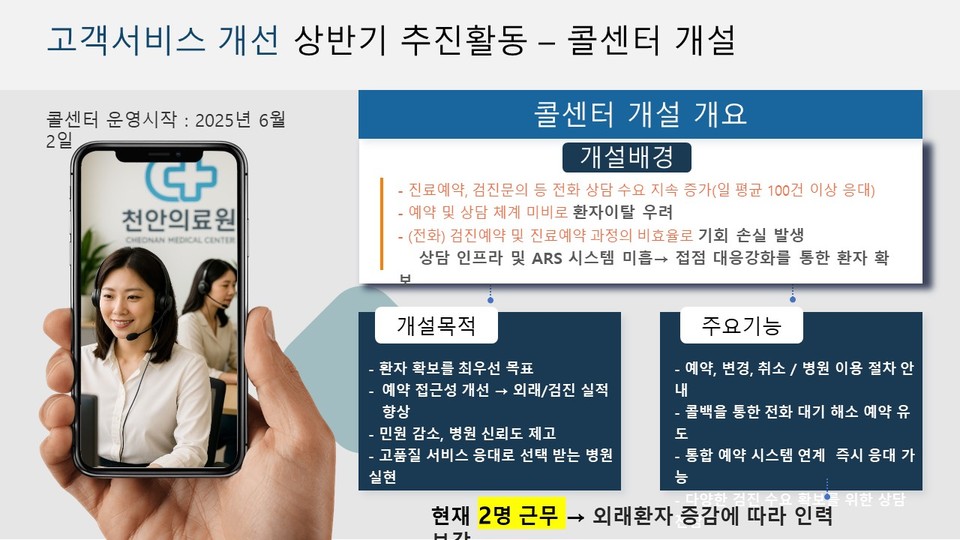 의료원에 따르면 콜센터 개소는 진료 활성화와 고객서비스 질 향상 전략 일환으로 환자의 첫 접점을 신속하고 정확하게 대응하는 전담 창구를 마련함으로써 병원 운영 전반의 효율성을 높이기 위해 도입됐다.