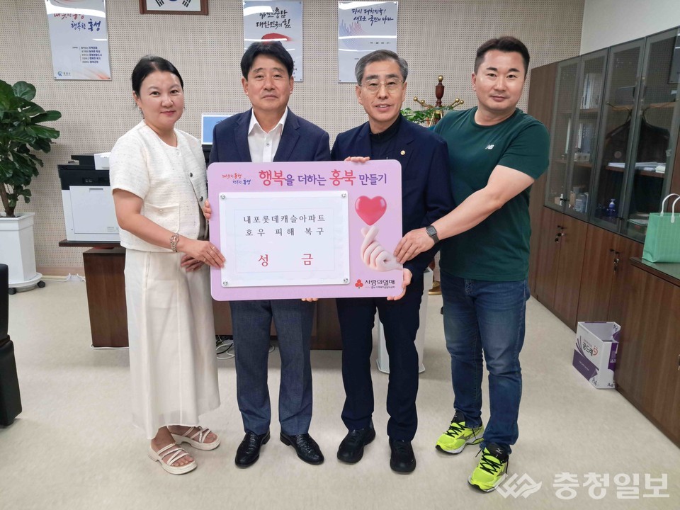 이번 성금은 지난 9일~10일 이틀간 아파트 단지 내에서 야외 물놀이 및 치킨데이 행사를 통해 모은 수익금으로, 집중호우 피해를 입은 홍성군민들을 돕기 위해 전달됐다.