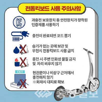 소방서는 △현관 등 출입구 근처에서의 충전 금지 △과충전 방지 △충전 중 주변 가연물 정리 △정품 충전기 사용 △배터리 손상 시 즉시 사용중이 등 안전 수칙 준수를 당부했다.