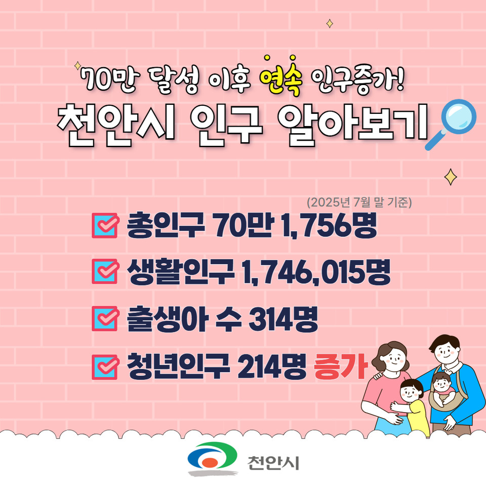 21일 시에 따르면 지난 7월 말 기준 천안시 총인구는 70만 1756명이다.
