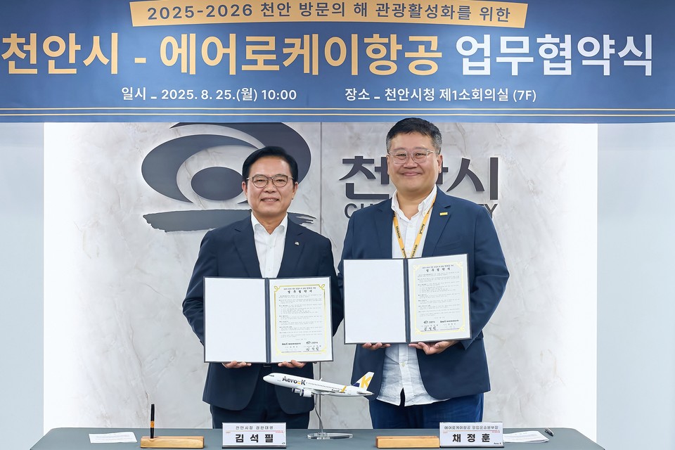 이번 업무협약은 2025-2026 천안 방문의 해를 맞아 천안시 관광 활성화와 에어로케이항공의 브랜드 가치를 높이고 국내·외 관광수요와 천안시 주요 관광자원을 효과적으로 연계하고자 체결됐다.