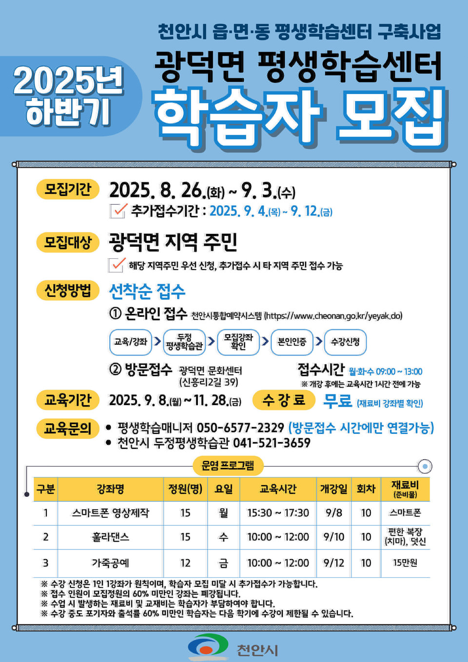 자세한 사항은 천안시 평생학습포털 누리집(http://www.cheonan.go.kr/lll.do)공지사항 확인 또는 두정평생학습관(☏041-521-3659)으로 문의하면 된다.