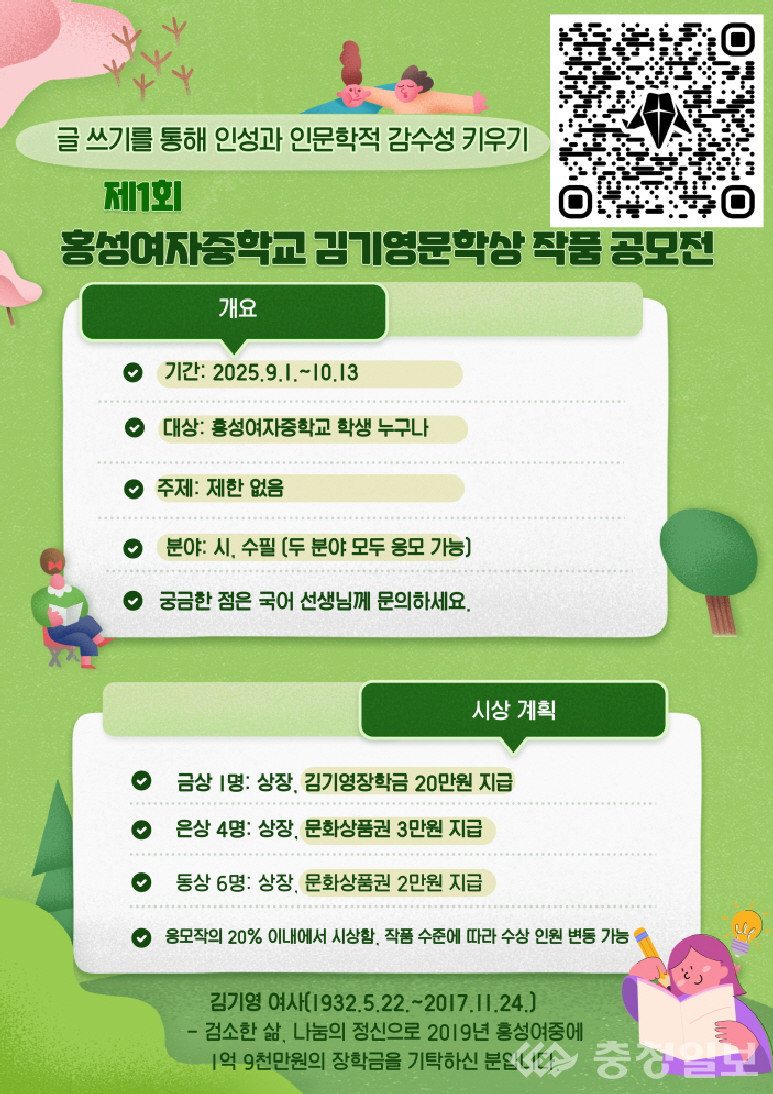 공모전은 9월 1일부터 10월 13일까지 진행되며, 홍성여자중학교 재학생이라면 누구나 참여 가능하다. 분야는 시, 수필 부문으로 이루어지며, 대상은 김기영장학금 20만 원이 수여된다.