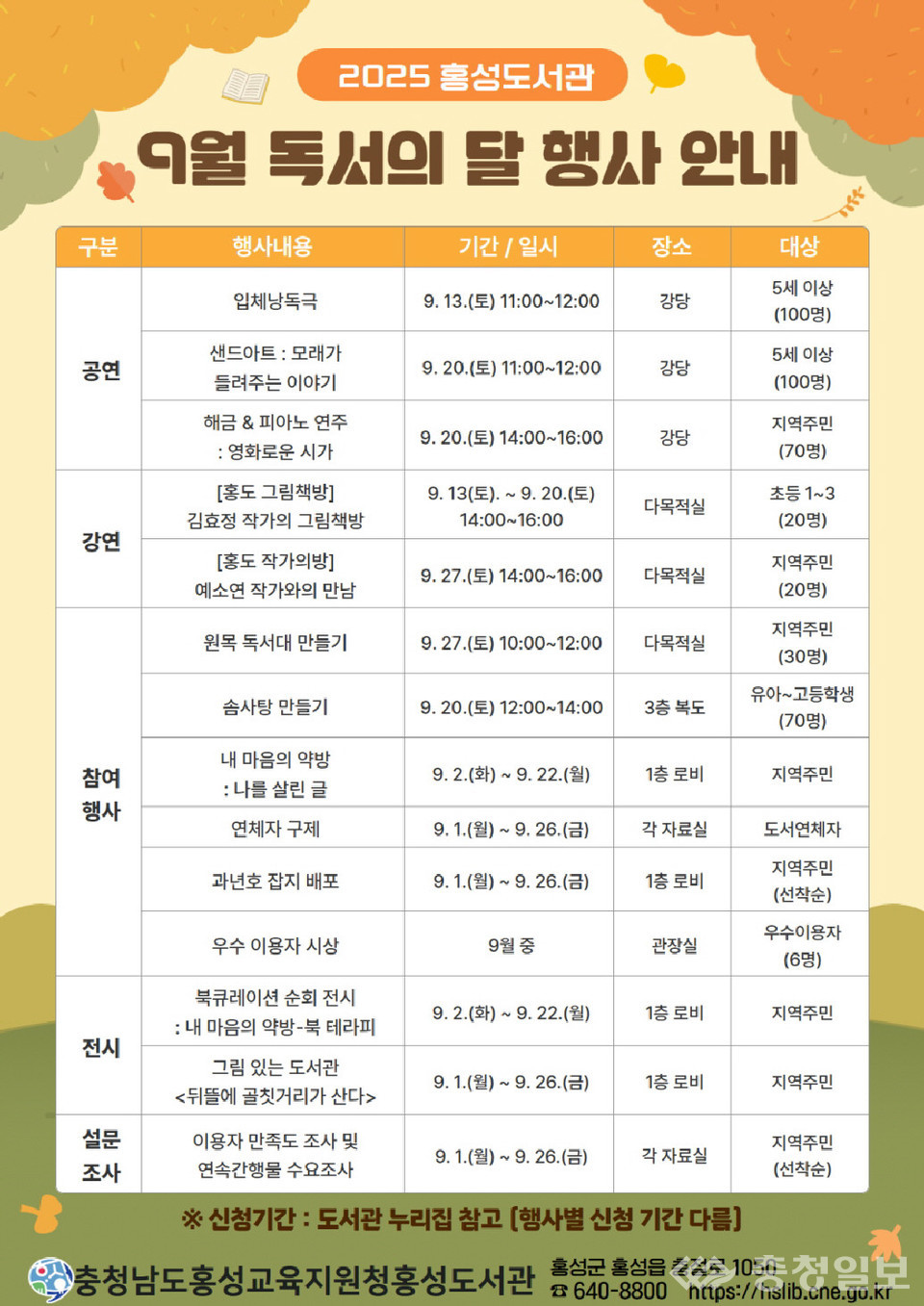 충남 홍성교육지원청홍성도서관은 9월 '독서의 달'을 맞이해 해'읽기 예보: 오늘 읽음, 내일 맑음.'슬로건을 토대로 다양한 독서문화 프로그램을 운영한다.