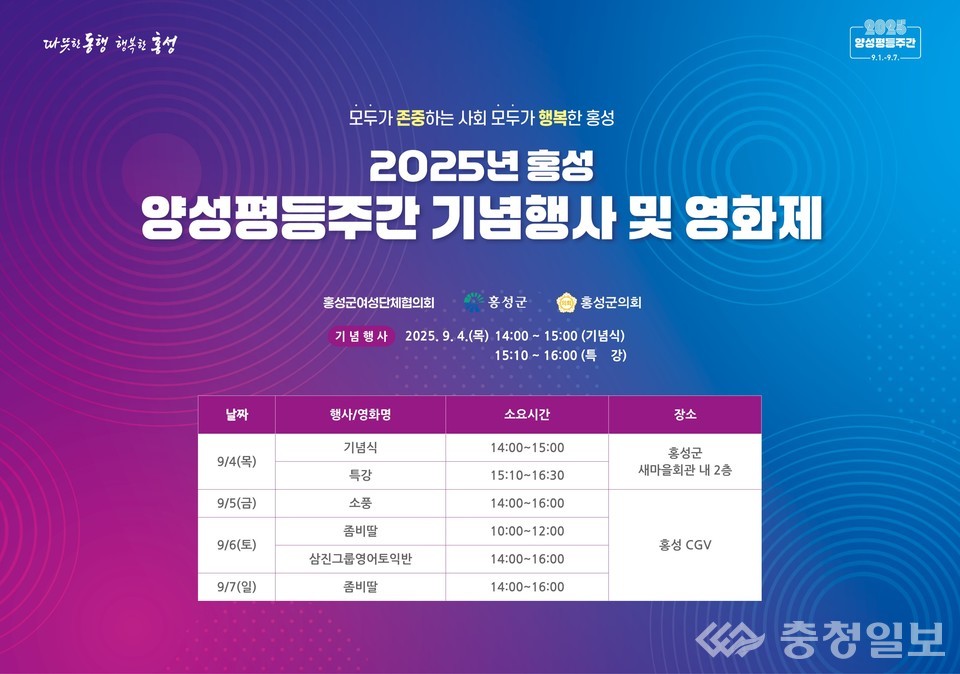 충남 홍성군은 '2025 홍성군 양성평등주간(9. 1. ~ 9. 7.)'을 맞아 군민과 함께하는 다양한 프로그램을 마련하며 성평등 문화 확산에 나섰다.