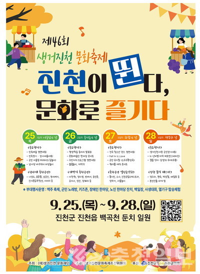충북 진천군의 대표 문화예술축제인 46회 생거진천문화축제가 오는 25∼28일 진천읍 백곡천 둔치 일원에서 열린다.