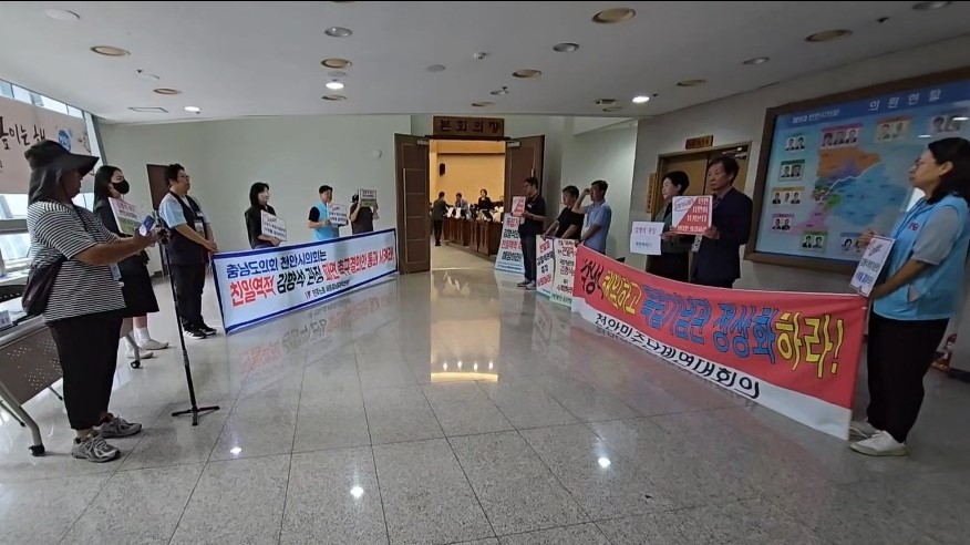 한편 본회의장을 방문한 지역 시민단체로 구성된 천안민주단체연대회의 회원들은 김형석 관장의 해임을 촉구하는 시위를 벌이며 항의했다.