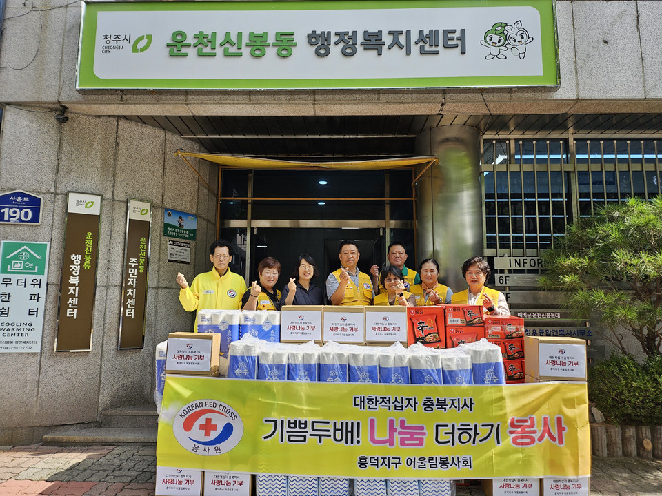대한적십자사 충북지사 흥덕구 어울림봉사회는 15일 운천신봉동 행정복지센터를 찾아저 저소득 취약계층 24가구를 위한 200만원 상당의 화장지, 라면, 세제가 들어있는 생필품 꾸러미를 기탁했다.