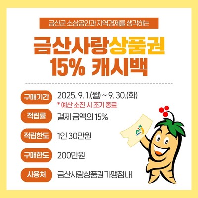 충남 금산군이 금산사랑상품권 9월 캐시백 적립률을 기존 10%에서 15%로 확대 적용하고 있다고 밝혔다.