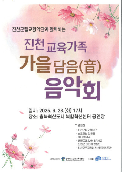 충북도 진천교육지원청은 23일 오후 5시 혁신도시 복합혁신센터에서 ‘교육가족 가을담음(音) 음악회’를 개최한다고 21일 밝혔다.