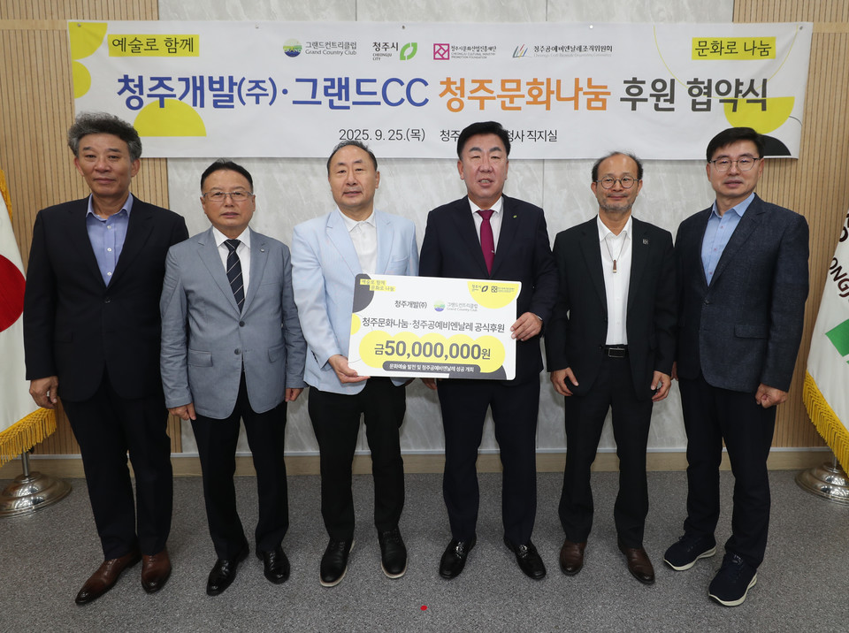 청주시문화산업진흥재단은 25일 청주시청 임시청사 직지실에서 청주개발㈜와 ‘청주문화나눔’ 후원식을 열고, 총 5000만원의 기부금을 전달받았다고 밝혔다. 이번 기탁으로 청주개발㈜은 지난해에 이어 총 1억원의 누적 기부를 달성했다.