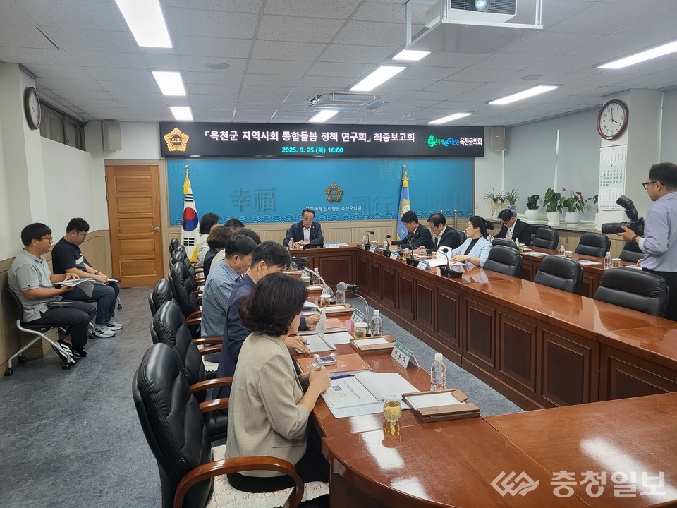 충북 옥천군의회 의원연구단체인'옥천군 지역사회 통합돌봄 정책 연구회(대표의원 이병우)'는 25일 의원 간담회실에서 '옥천군 지역사회 통합돌봄 지원체계 구축 방안' 연구용역 최종보고회를 개최했다.
