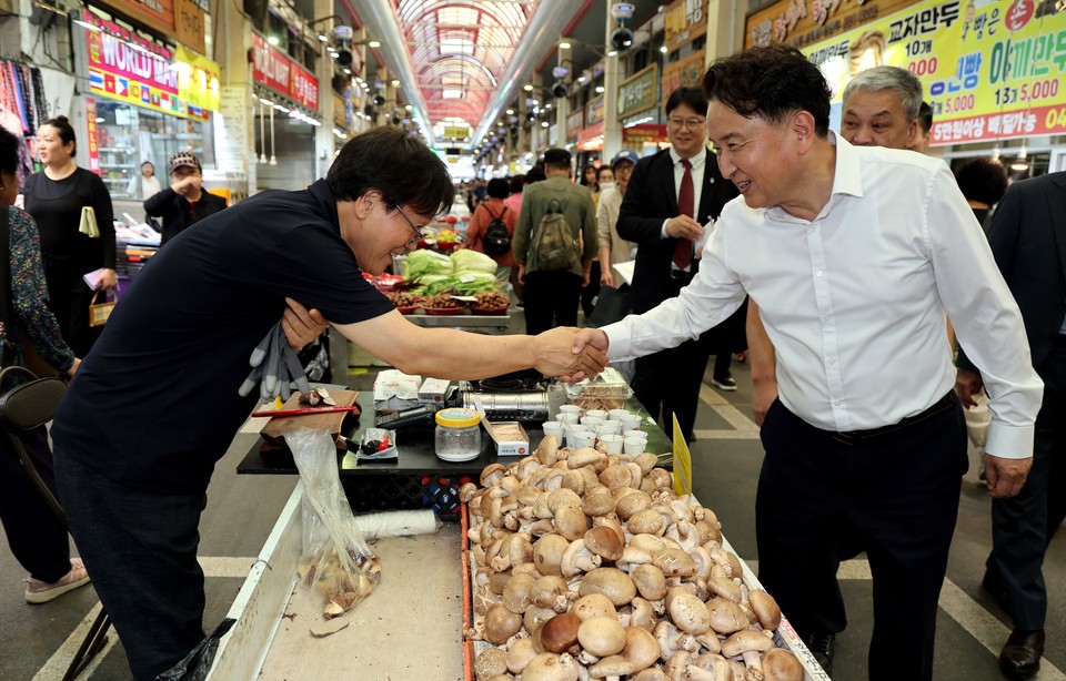김영환 충북도지사는 추석을 앞둔 29일 지역 대표 전통시장인 청주 육거리종합시장을 찾아 구석구석을 둘러보며 명절 성수품인 지역 농·축산물 등을 직접 구매하는 등 민생 현장 소통 행보에 나섰다.