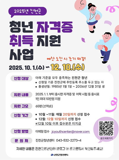 충북 진천군 청년센터는 청년들의 직무 역량 강화와 진로 설계를 돕기 위해 ‘청년 자격증 취득 지원사업’을 시행한다고 9일 밝혔다.