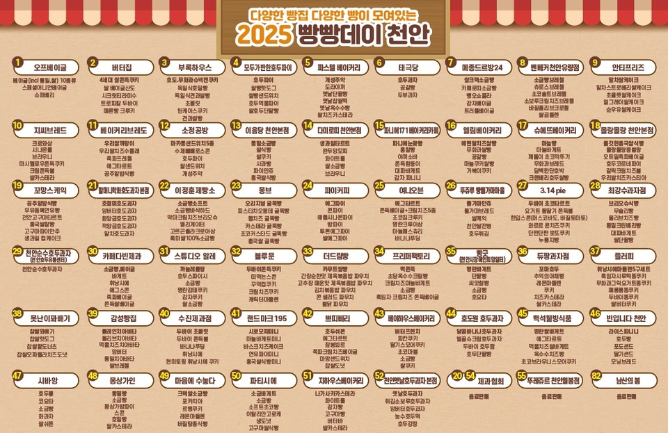 행사의 자세한 내용 및 참여빵집 리스트는 '빵빵데이 천안' SNS와 천안시청 누리집에서 확인할 수 있다.