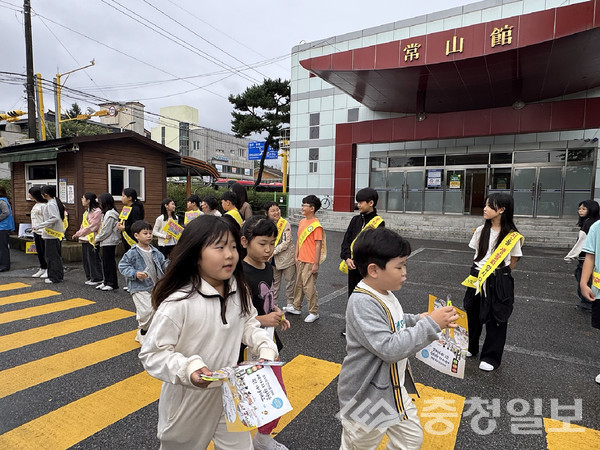 충북 진천군 진천상산초등학교와 경찰서, 교육청, 모범운전자회, 녹색어머니회 등은 16일 진천상산초 정문 앞에서 등굣길 어린이 교통안전 캠페인을 진행했다.
