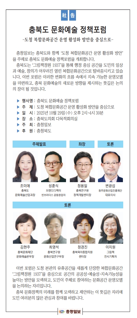 도청 복합문화공간 운영 활성화 방안을 중심으로 충청일보 webmaster@ccdailynews.com 다른기사 보기 저작권자 © 충청일보 무단전재 및 재배포 금지 당신만 안 본 뉴스 충청내륙고속화도로 12월 완전 개통... 충북 반나절 생활권 대전 도시정책, 설계부터 다시 짚어야 청주 산업지형 ‘대전환’…떠나는 분리막, 들어오는 HBM 세종지역 아파트 공급 가뭄 해소되나 대통령실·민주당, '행정수도 세종시 이전' 정책 본격 추진 나서 진천군수 선거 본격 점화···여야 6명 ‘무주공산’ 놓고 각축 “문 닫는 가게가 더 많다”…충북 자영업 폐업, 올해 벌써 지난해 추월 충청내륙고속화도로 12월 완전 개통... 충북 반나절 생활권 댓글삭제 삭제한 댓글은 다시 복구할 수 없습니다. 그래도 삭제하시겠습니까? 비밀번호 닫기 기사 댓글 0 댓글 접기 로그인 후 이용 가능합니다. 댓글 내용입력 비회원 로그인 이름 비밀번호 댓글 내용입력 댓글쓰기 계정을 선택하시면 로그인·계정인증을 통해 댓글을 남기실 수 있습니다. 회원 로그인 비회원 글쓰기 이름 비밀번호 자동등록방지 로그인 옵션 창닫기 주요기사 3분기 카드 해외사용 59억달러… 사상 최대 기록 충북 소비자심리지수 116.8… 2010년 이후 최고치 기록 충북도, 'AI 페스타 2025'로 AX 혁신거점 도약 청년 취업난에 직업계고 졸업생 절반은 대학 진학 청주서 수년 만에 출현한 바바리맨, 경찰 검거 기온 변동성 큰 이번 겨울, 짧고 간헐적 추위 찾아와