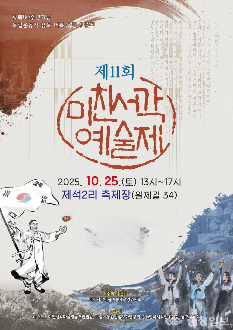 제11회를 맞는 미친서각 예술제가 남포면 미친서각마을 축제장(원제길 34)에서 열린다. 올해는 광복 80주년을 맞아 '독립운동가 유묵·어록 새김전'을 테마로 특별히 기획됐다.