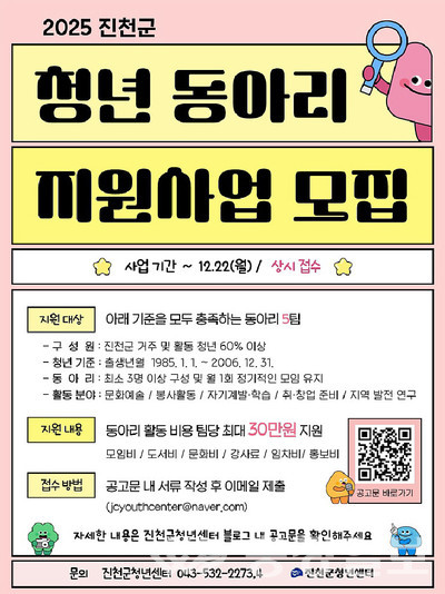 자세한 사항은 진천군청년센터 인스타그램(@jcyouthcenter)·블로그(blog.naver.com/jcyouthcenter)를 참고하거나 (전화☏043-532-2273-4)로 문의하면 된다.