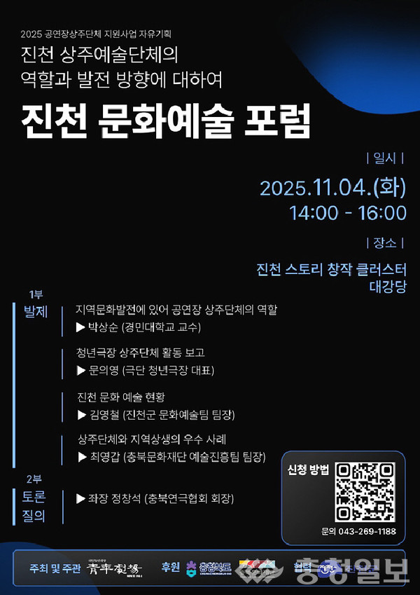 정창석 충북연극협회장이 좌장을 맡고 △박상순 경민대학교 공연예술과 교수 △김영철 진천군 문화예술팀장 △최영갑 충북문화재단 팀장 △문의영 극단 청년극장 대표 등이 발제와 토론에 참여한다.