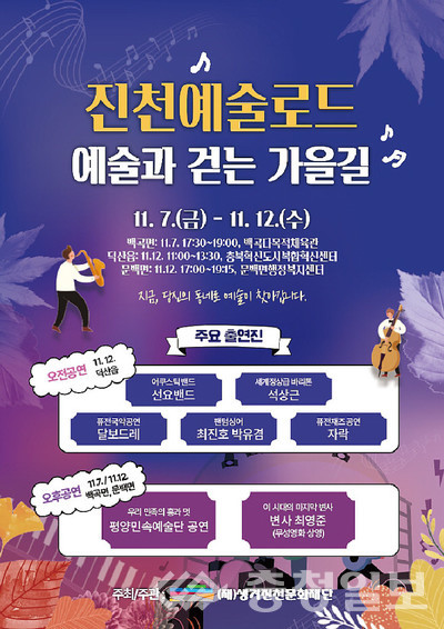 (재)생거진천 문화재단(대표이사 박충서)은 찾아가는 문화공연 ‘진천예술로드, 예술과 걷는 가을 길’을 개최한다고 5일 밝혔다.