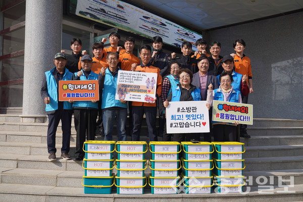 충북 진천군 노인복지관 선암회와 소방서발전위원회가 6일 소방의날을 맞아 진천소방서에 격려품을 전달하며 직원들 노고에 감사를 표했다.