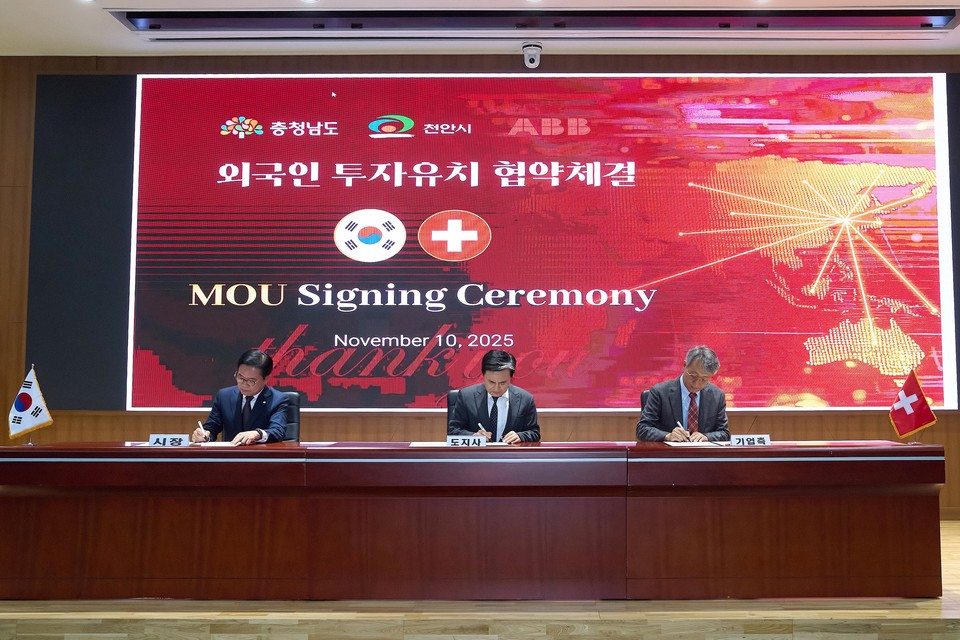 도청 대회의실에서 열린 협약식에는 김석필 천안시장 권한대행 부시장과 김태흠 충남지사, 최준호 ABB코리아 대표이사 등이 참석했다.