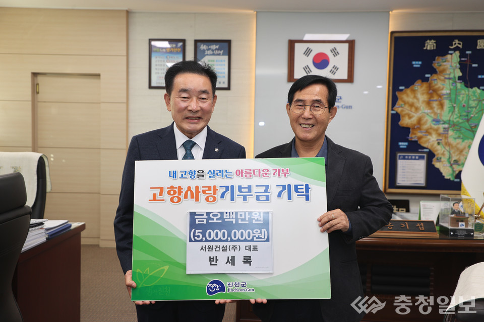 서원건설(주) 반세록 대표가 10일 충북 진천군청에서 송기섭 진천군수(왼쪽)에게 고향 사랑 기부금 500만원을 전달했다.