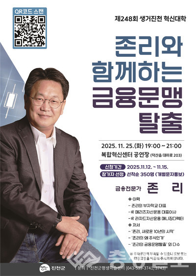 충북 진천군은 오는 25일 충북혁신도시 복합혁신센터 공연장에서 금융전문가 존 리를 초청해 248회 생거진천 혁신대학 강좌를 개최한다고 11일 밝혔다.