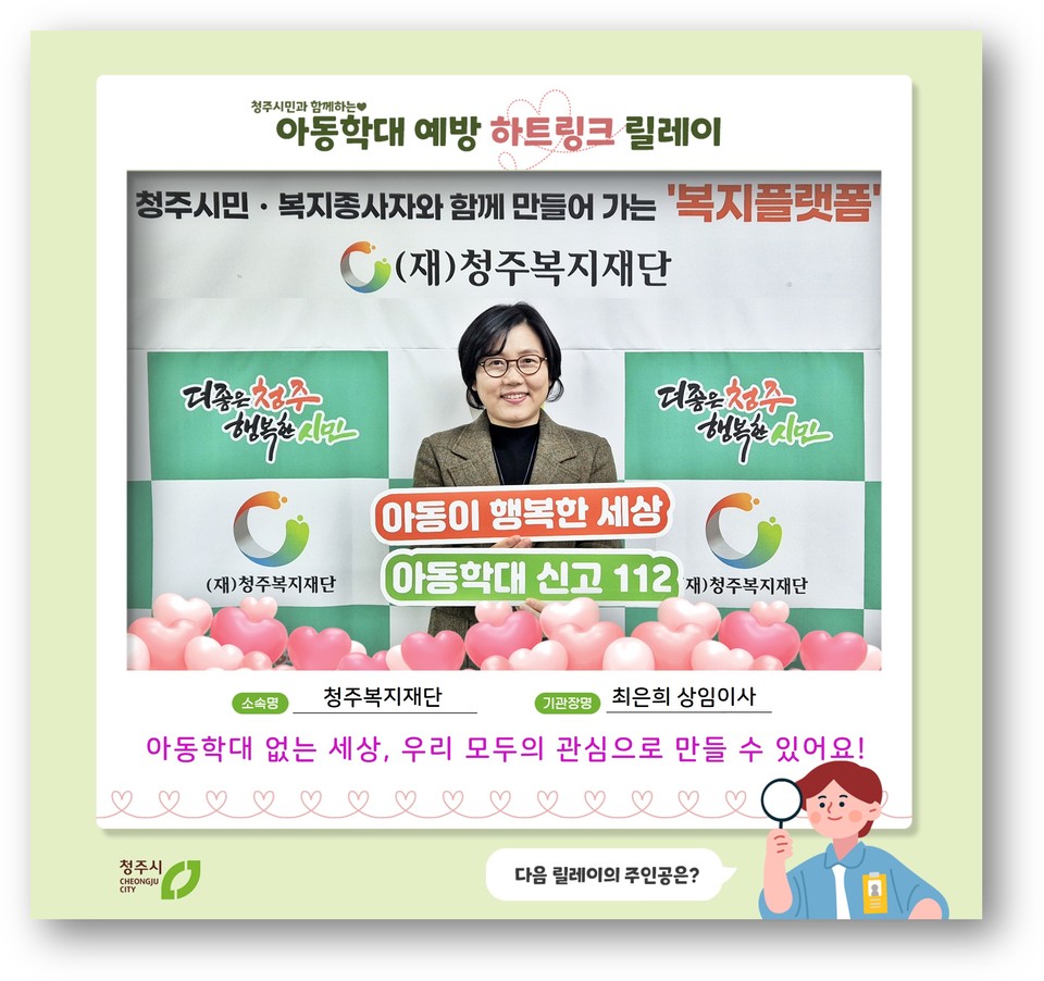 최은희 충북 청주복지재단 상임이사는 11일 아동학대 예방 캠페인 ‘하트링크 릴레이’에 참여했다.