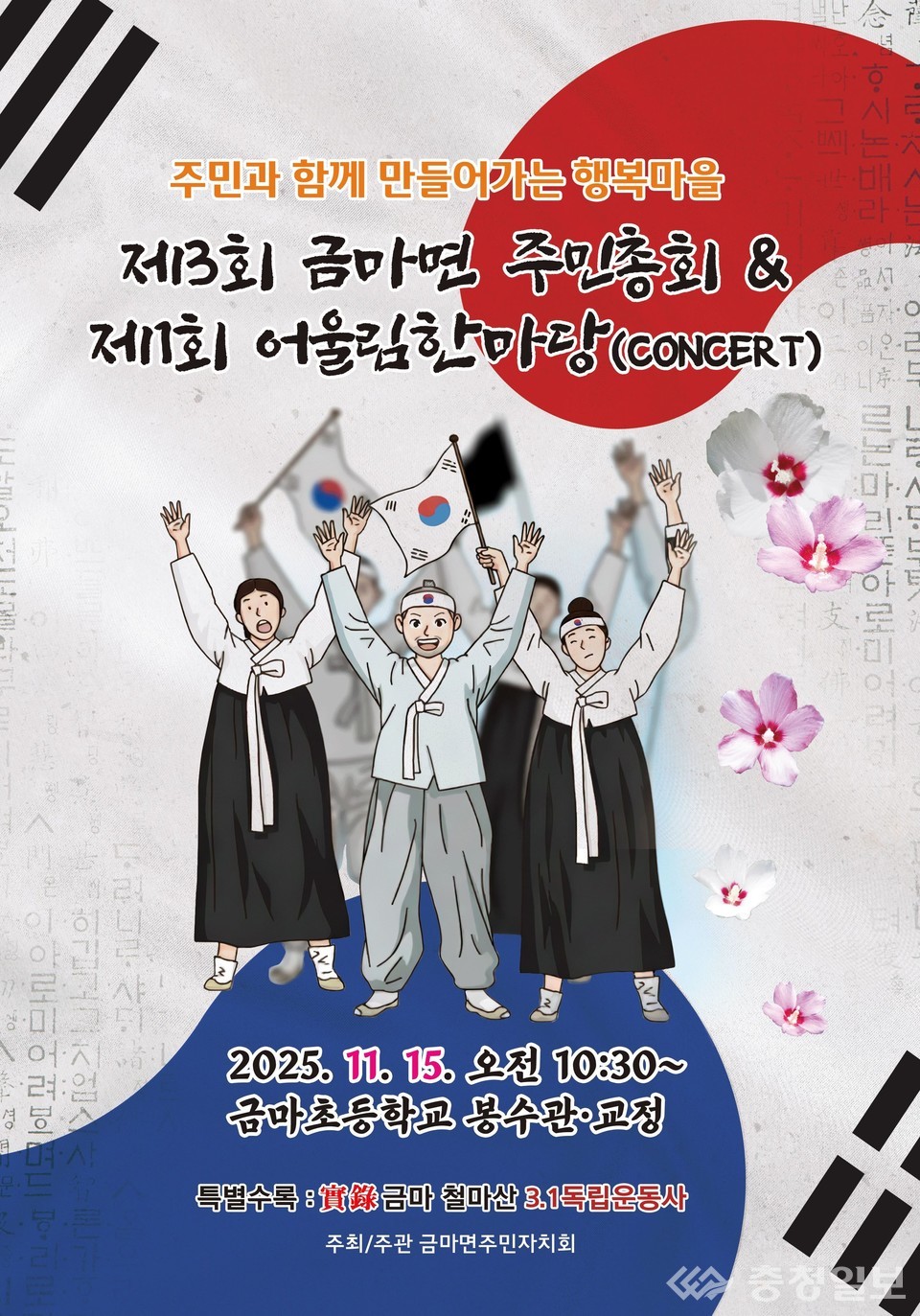 충남 홍성군 금마면주민자치회가 주민과 함께 만들어가는 행복마을 제3회 금마면주민총회 및 제1회 어울림한마당 콘서트를 오는 15일 금마초등학교 봉수관에서 개최한다,