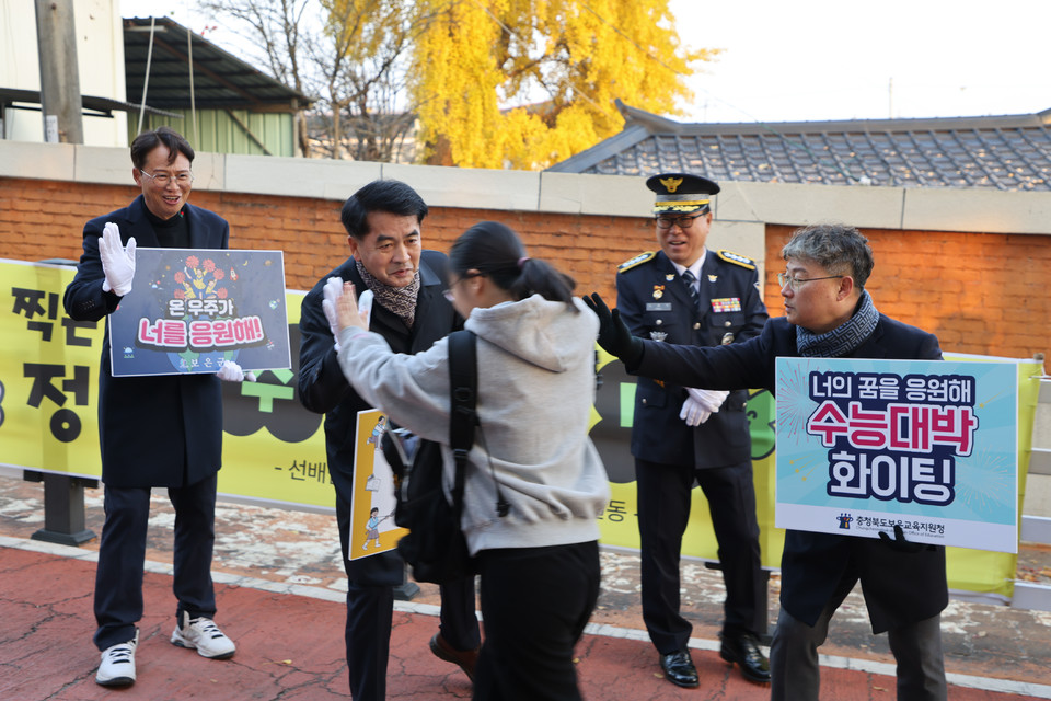 13일 2026학년도 대학수학능력시험 충북 59지구 3시험장이 마련된 보은읍 보은고교 앞에서 최재형 보은군수와 윤대성 보은군의장, 전병일 보은교육장, 노광식 보은경찰서장이 입실하는 수험생을 응원하고 있다./보은=심연규기자
