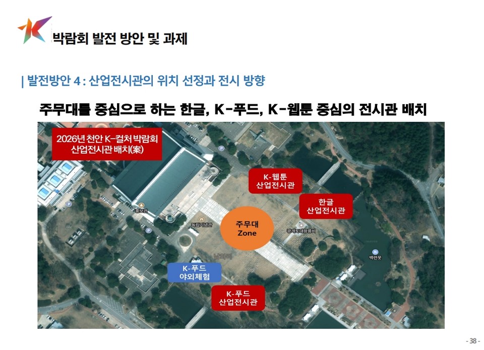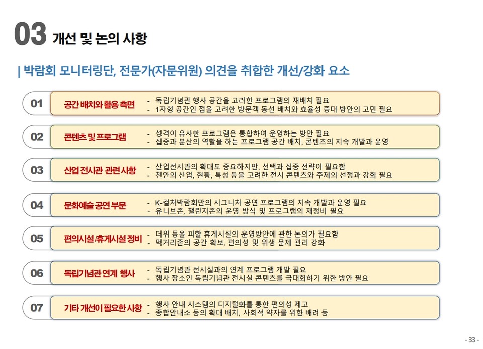 개최 시기 고정, 공간 재배치, 산업전시관 선택·집중 전략, 독립기념관 연계 프로그램 강화, 대학 연계 청년 무대 운영, 챌린지존·유니브존 통합, 친환경·안전 박람회 운영, 사회적 약자 배려 확대, 위생·휴게시설 확충, 디지털 안내 고도화 등이다.
