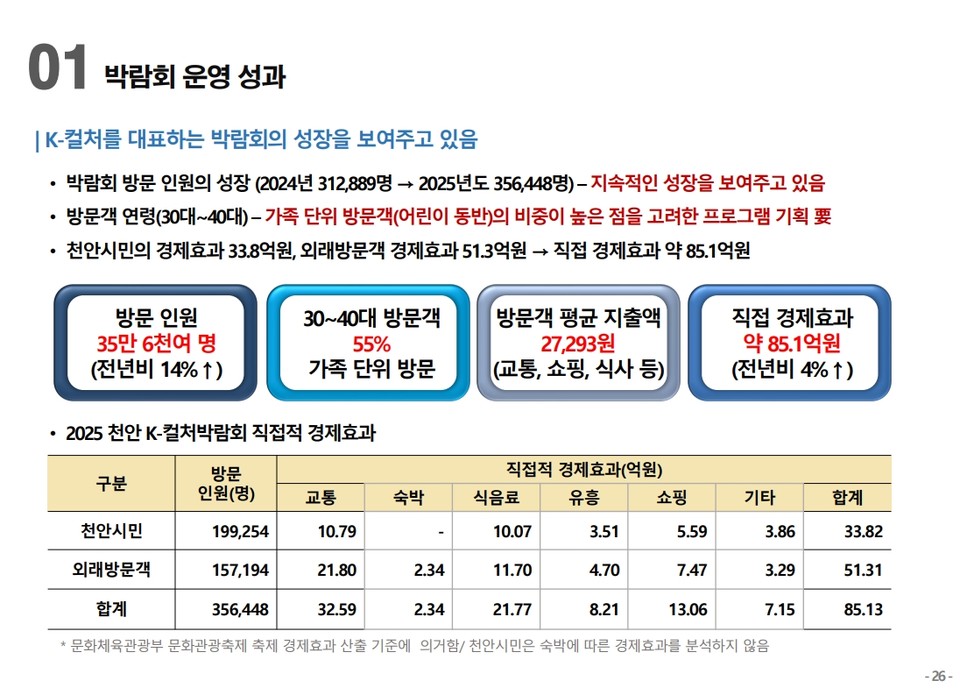 시 K-컬처박람회 관계자는 "지금의 박람회는 성장 가능성이 매우 크지만 콘텐츠 구조를 정교하게 재배치하고 핵심 분야에 집중하는 전략이 필요하다"며 "명실상부한 대한민국 대표 융복합 문화축제가 되도록 발전 전략을 충실히 반영하겠다"고 밝혔다. /천안=김병한기자