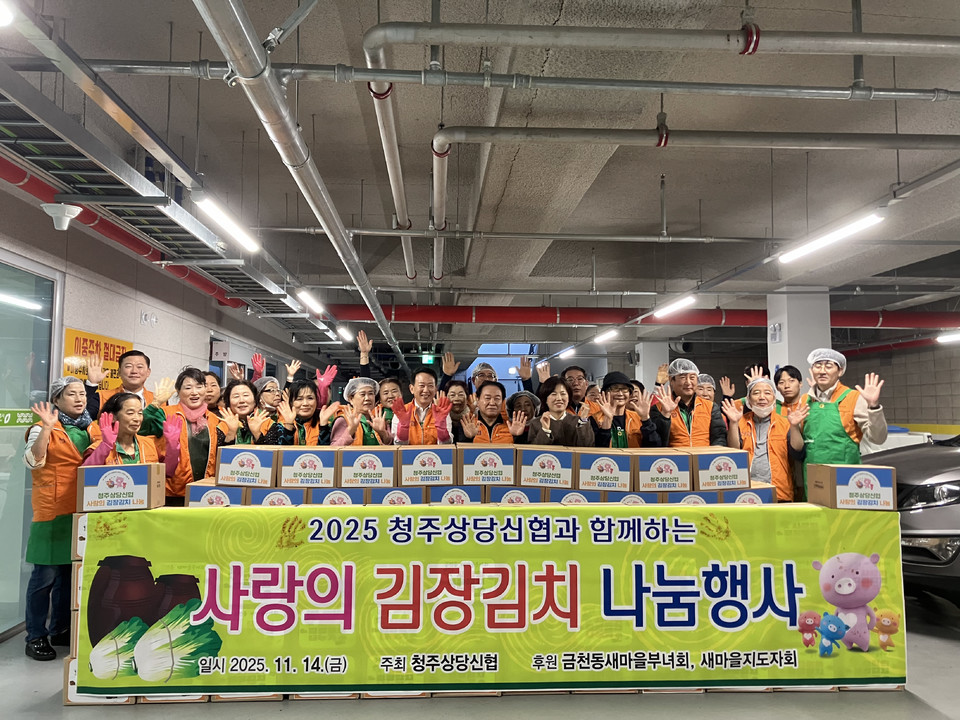 청주상당신협 두손모아봉사단은 금천동새마을지도자협의회, 새마을부녀회와 함께 금천동 행정복지센터 주차장에서 ‘사랑의 김장김치 나눔 행사’를 열었다고 17일 밝혔다. 행사에는 이성희 이사장과 풍수련 금천동 행정복지센터장이 참여했으며, 자원봉사자 50여 명이 700kg 분량의 김장을 정성껏 담가 독거노인, 경로당 등 취약계층에 전달했다.