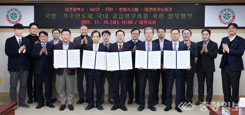 대전시는 이날 시청에서 KAIST, 한국전자통신연구원(ETRI), 한화시스템, 대전테크노파크와 함께 국방·우주반도체 개발 및 공급망 강화를 위한 업무협약을 체결했다. 협약식에는 △대전시 이장우 시장 △KAIST 이광형 총장 △ETRI 방승찬 원장 △한화시스템 손재일 대표 △대전테크노파크 김우연 원장이 참석해 전략기술 협력체계 구축 의지를 공유했다.