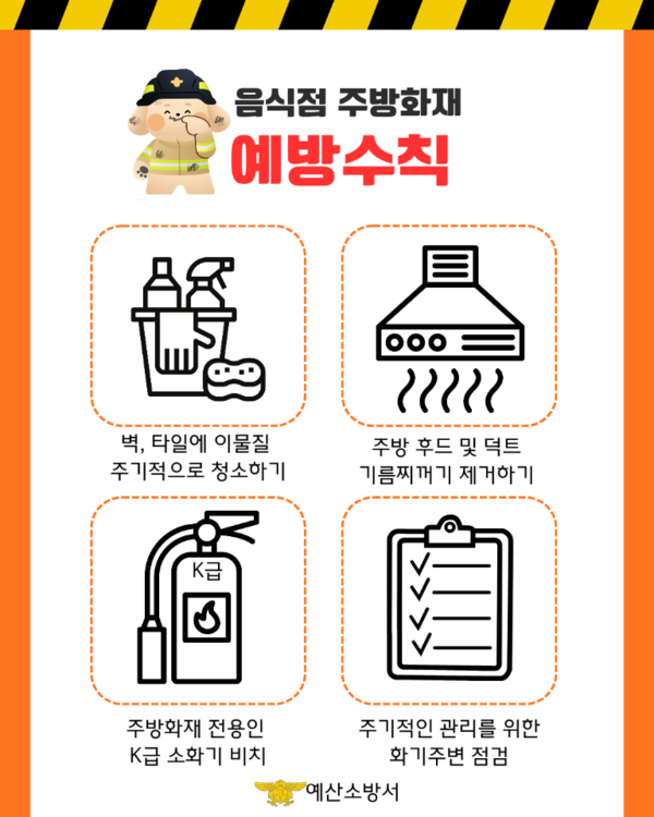 소방서에 따르면 주방에서 사용하는 식용유는 발화점이 높아 초기 대응이 미흡할 경우 짧은 시간 안에 대형화재로 이어질 수 있어 벽, 타일에 이물질 주기적으로 청소하기, 후드·덕트 기름찌꺼기 제거하기, K급 소화기 비치하기, 주기적인 관리를 위한 화기 주변 점검 등을 반드시 준수해야한다고 강조했다.