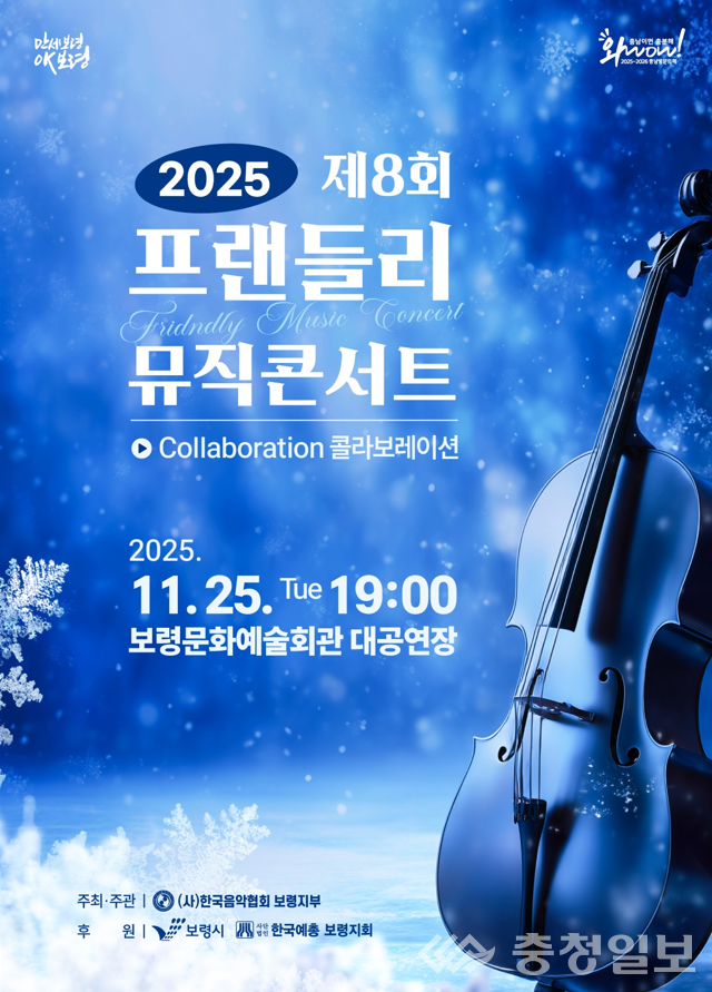 충남 (사)한국예총 보령지회 음악지부가 주관하는 '8회 프렌들리 음악회'가 오는 25일 오후 7시 보령문화예술회관 대공연장에서 개최되어 보령시민들에게 특별한 문화향유의 기회를 제공한다.