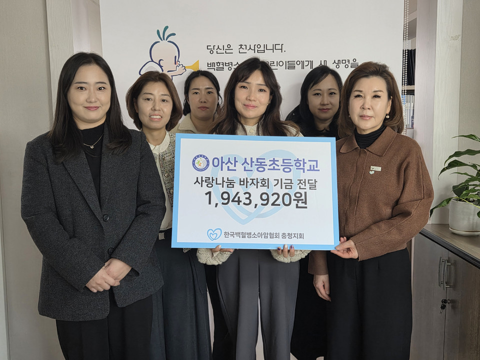 충남 아산산동초등학교(교장 김선중) 학부모회(회장 설진성)와 운영위원회(위원장 임선우)는 최근 개최한 꿈빛나눔축제 수익금을 20일 (사)한국백혈병소아암협회 충청지회(회장 박우성)에 전달했다.