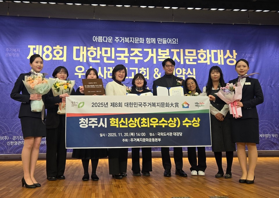 이번 시상식에서 시가 추진한 △주거복지특구 '다행리 2115' 조성 △위기가구 발굴 프로젝트 '행복하우징 청주' △청주형 긴급지원주택 '디딤하우스' △저장강박증 의심가구 지원 '깔끄미봉사단' △광복 80주년 독립유공자 주거개선사업 '영웅의 행복한 집' △취약계층 '재래식화장실 개선사업 등이 높은 평가를 받았다.