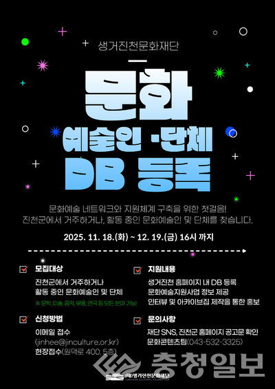 (재)생거진천 문화재단은 오는 12월 19일까지 충북 진천군 문화예술인·단체 데이터베이스(DB) 구축을 위해 등록 신청을 받는다고 23일 밝혔다.