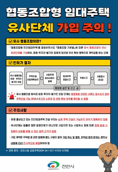 충남 천안시가 민간임대주택 모집과 관련해 무분별한 가입 홍보가 증가함에 따라 시민들의 각별한 주의를 당부하고 나섰다.