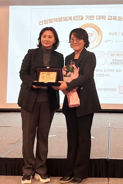남서울대는 24일 고용노동부와 한국산업인력공단 주관으로 열린 산업별역량체계(SQF) 기반 대학 교육과정 인정서 수여식에서 가상현실학과 교육과정이 공식적으로 인증을 받았다고 밝혔다.
