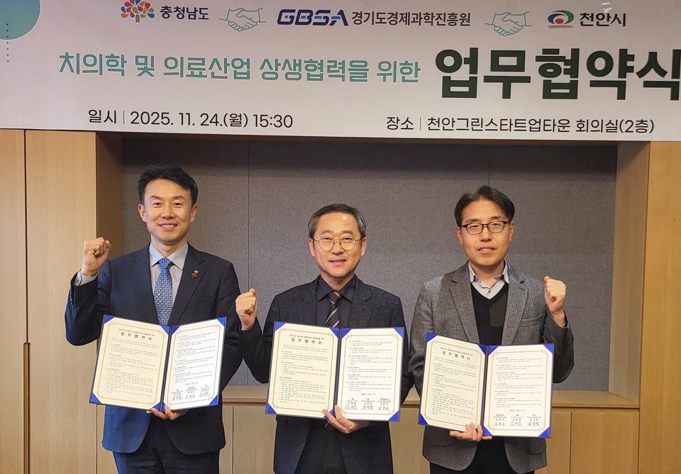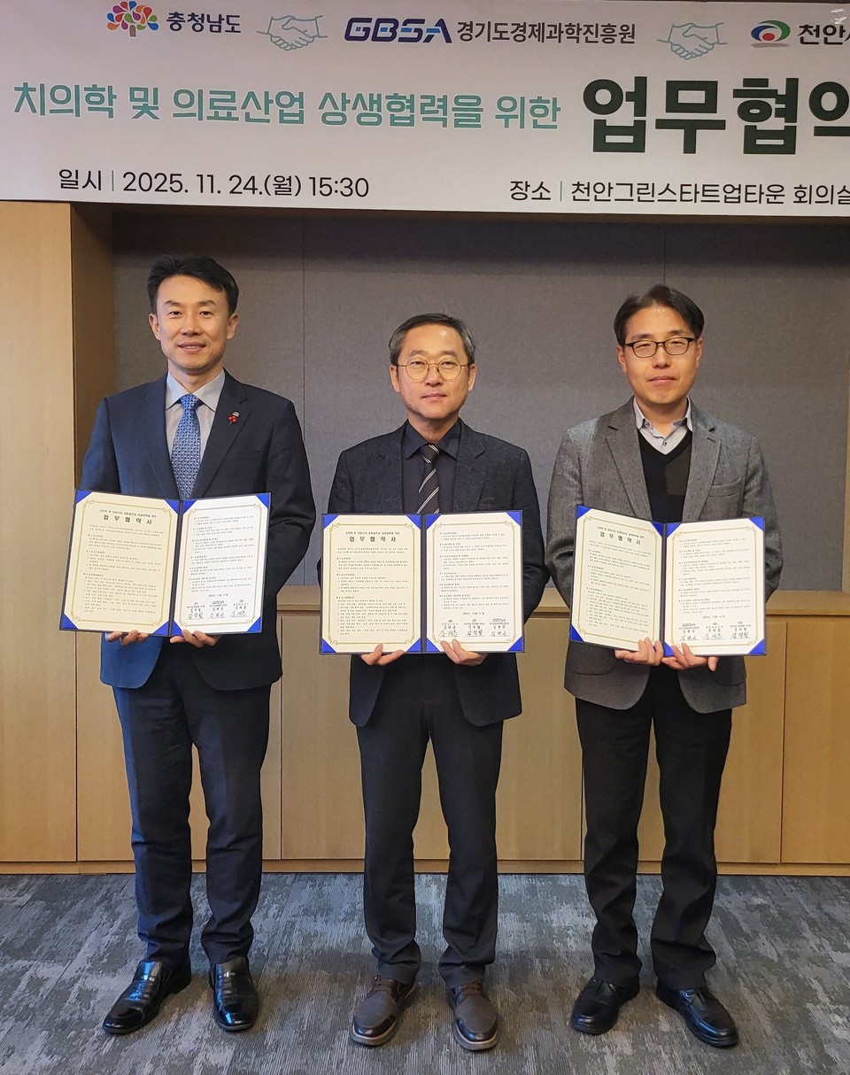 충남 천안시는 충청남도·경기도경제과학진흥원(GBSA)과 치의학 및 바이오 산업 전주기 협력체계 구축을 위한 업무협약을 체결했다고 24일 밝혔다.
