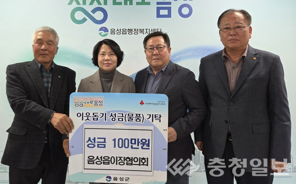 충북 음성군 음성읍이장협의회(회장 곽혁근)는 지역사회 복지증진과 이웃사랑 실천을 위해 음성읍지역사회보장협의체(공동위원장 이재선·이양희)에 이웃돕기 성금 100만원을 기탁했다고 25일 밝혔다. /음성=김록현기자