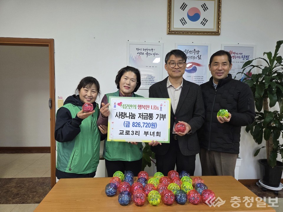 이날 전달한 사랑 나눔 저금통은 교로3리 부녀회 회원들과 이장님 등 마을 임원진 38명이 함께 동전 모으기 운동을 펼치면서 모은 금액으로, 면 내 어려운 이웃을 위한 사업비로 사용할 예정이다.